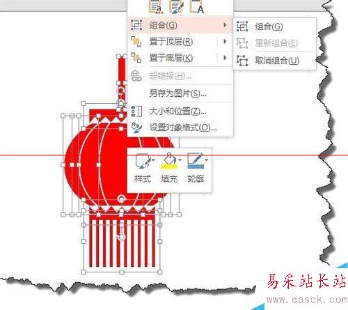 3、選擇復制好的燈籠穗,右擊在彈出的菜單中選擇“組合”將它們組合成一個整體。