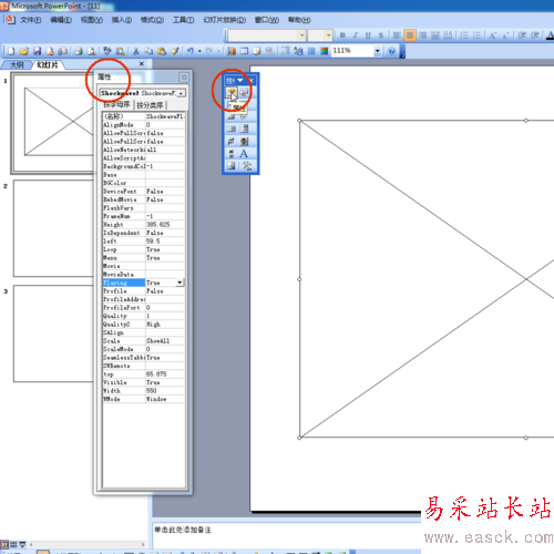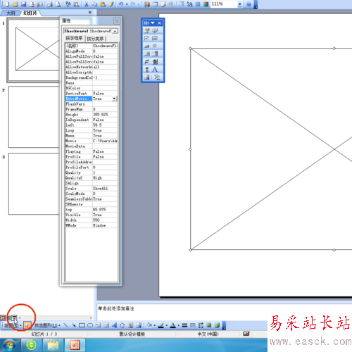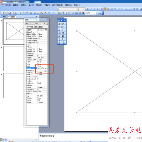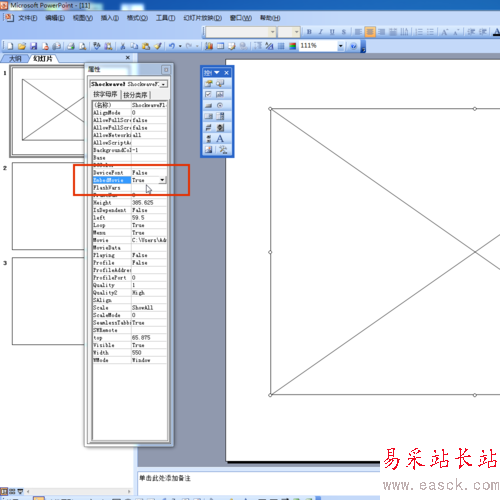 在屬性框里的embedmovie的右側選擇”True“。(注意:這樣做的好處是盡管ppt與Flash不在同一個文件夾里Flash還可以播放!)