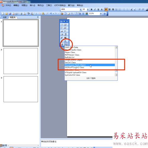 在出現(xiàn)的控件工具箱里,左鍵單擊右下角按鈕,選擇“shockwave flash object”。