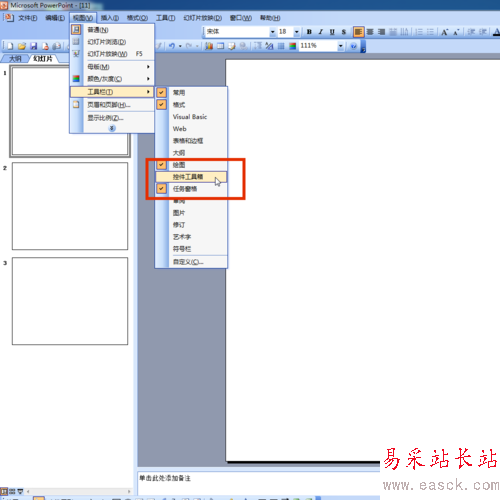 打開需要插入Flash文件的ppt。找到“視圖”——“工具欄”——“控件工具箱”,左鍵單擊。