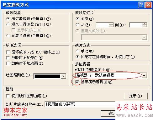 3、在PPT里,選菜單 幻燈片放映-設置放映方式,如下圖,選擇監視器2,勾選 “顯示演示者視圖”,確定。