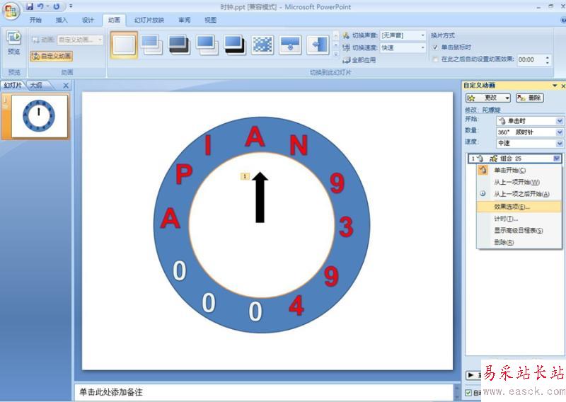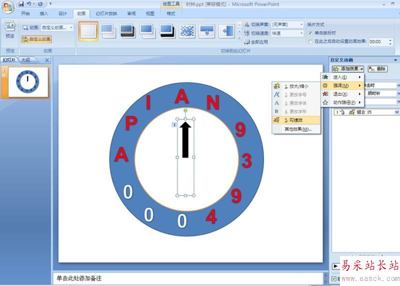6、選中時針,選擇“自定義動畫”,添加“動作效果”為:強調-->陀螺旋。