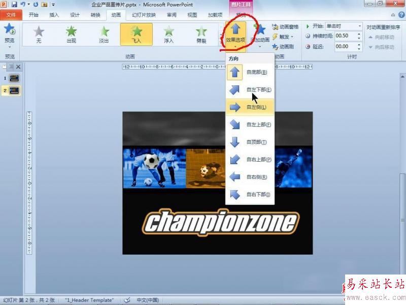 為該圖片設(shè)置動(dòng)畫效果后,還可以通過效果選項(xiàng)更改其效果,在默認(rèn)情況下是從底部自動(dòng)飛入的,可以改成其他的方向。只需將鼠標(biāo)移動(dòng)到相應(yīng)選項(xiàng)上,在幻燈片當(dāng)中就可以實(shí)時(shí)預(yù)覽到相應(yīng)效果。