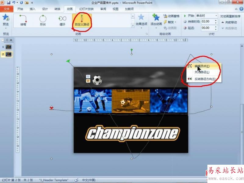用戶還可以自定義路徑,這樣就可以在幻燈片當(dāng)中自己隨意繪制路徑。路徑繪制完之后直接雙擊鼠標(biāo)就可以預(yù)覽該效果。如果對(duì)該路徑不滿意的話,可以鼠標(biāo)右鍵單擊來執(zhí)行編輯頂點(diǎn)來修改該路徑。路徑修改完之后可以通過單擊預(yù)覽選項(xiàng)組中的預(yù)覽按鈕來預(yù)覽效果。