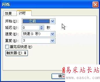 2、繼續單擊“添加效果”/“強調”/“閃爍”,為其添加閃爍效果。此時我們在“自定義動畫”窗格中可以看到該對象已經添加了兩個動畫效果,在第二個效果的右側選擇“計時”(如圖2),在出現的“閃爍”選項對話框中,將“開始”設置為“之前”(默認是“單擊時”),重復設置為“3”(可根據自己的需要設置,如圖3),設置完畢后按“確定”退出。