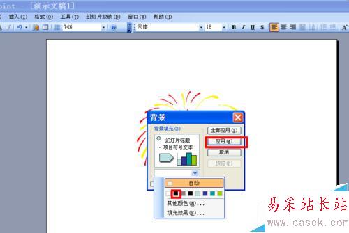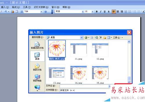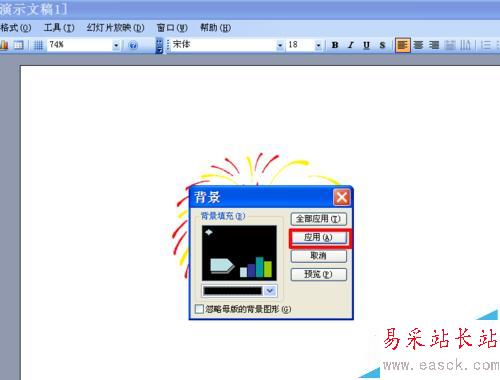 3、打開ppt,新建一個演示文稿。點擊菜單“插入”——“圖片”——“來自文件”,在插入圖片對話框中選擇之前制作的煙花素材,點擊“插入”。因為煙花都是在夜空中綻放,所以這里小編要把背景設置為黑色,點擊菜單“格式”——“背景”,選擇黑色背景,點擊應用。
