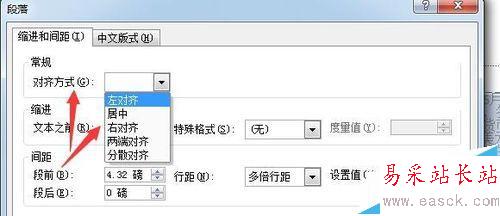 3、在彈出的段落設置界面中,可以在對齊方式那一欄,選擇居中,還是左對齊,右對齊