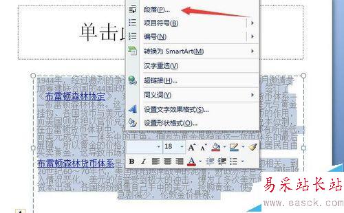 2、選中相應的文字內容,點擊鼠標右鍵,再彈出的菜單中,選擇段落選項