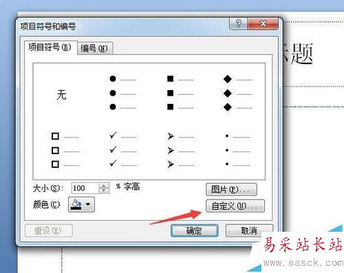 5、在彈出的項目符號和編號的界面中,點擊自定義按鈕,進(jìn)行自己設(shè)置