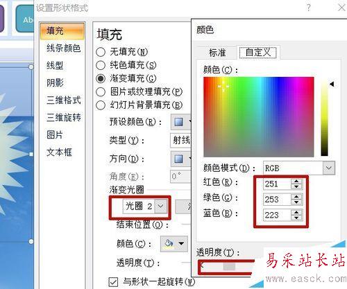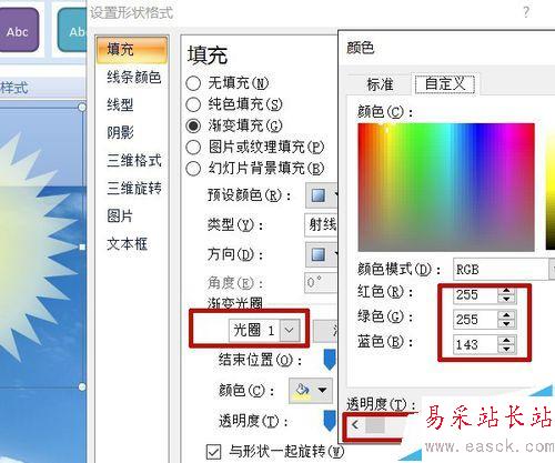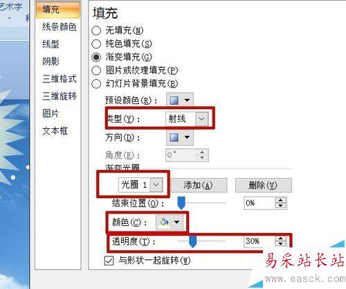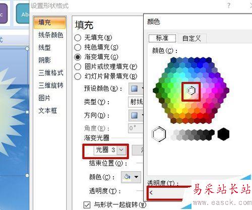 11、形狀填充依然是漸變,類型射線,光圈1、2、3顏色白色,透明度分別為30%、70&、100%。