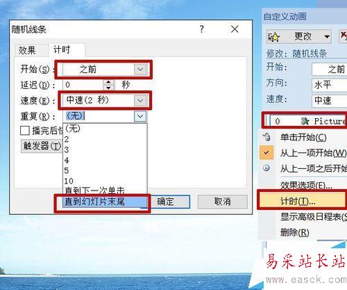 4、選中該動(dòng)畫效果,右鍵——計(jì)時(shí),開始欄里選“之前”,速度中速,重復(fù)選“直到幻燈片末尾”。