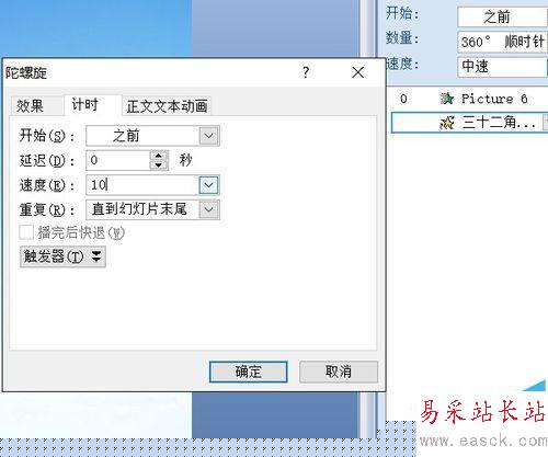 9、選中該動(dòng)畫,右鍵——計(jì)時(shí),開始選“之前”,重復(fù)選“直到幻燈片末尾”。速度想讓他很慢,預(yù)設(shè)的達(dá)不到效果,所以手動(dòng)輸入,選中速度欄數(shù)值,輸入10,將其轉(zhuǎn)速改為10秒。
