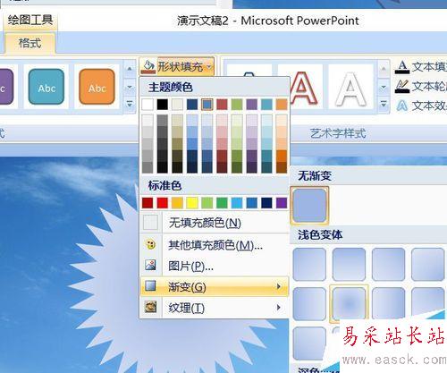 6、繪圖工具——格式,形狀輪廓選無(wú)輪廓。形狀填充——漸變——中心輻射。