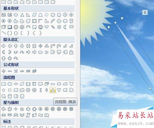 10、插入——形狀——流程圖——摘錄,畫出長(zhǎng)長(zhǎng)的一條三角作為光線,旋轉(zhuǎn)至合適位置。
