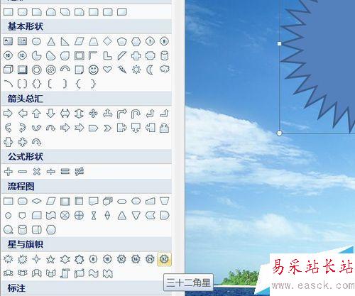 5、插入——形狀——星與旗幟——32角星,拉出一個(gè)星形,作為發(fā)光的太陽(yáng)。