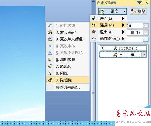 8、將其移動(dòng)到舞臺(tái)左上角。自定義動(dòng)畫——添加效果——強(qiáng)調(diào)——陀螺旋。