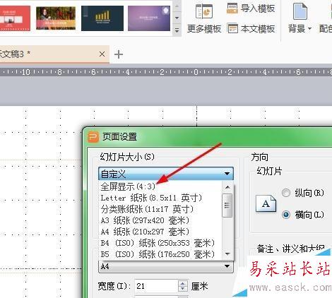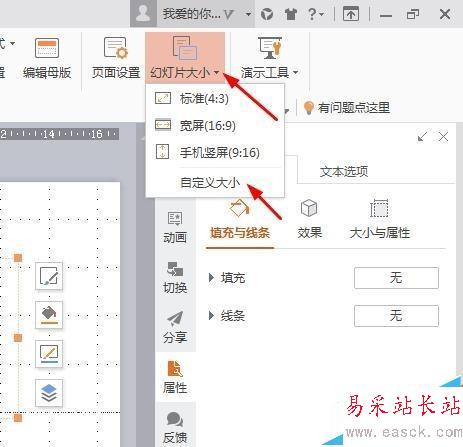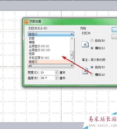 2、我們在找到幻燈片大小,點(diǎn)擊倒三角菜單,彈出設(shè)置,選擇自定義。