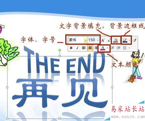 6、同樣寫上藝術字“再見”,右鍵,在出現的文本格式欄中將字體改為“隸書”,字號寫成150(手動輸入的字號,需要回車方可),另外,文本顏色、是否加填充塊等個人按需選擇。