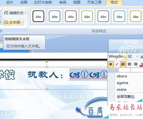 10、格式工具欄中選擇文本框,拖出一個文本框,在其中輸入學校與執教人。右鍵選擇字體、字號,隨所需自選。我選用了32號字,學校用的彩云,執教人用Wingdings 2符號代替。