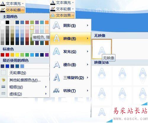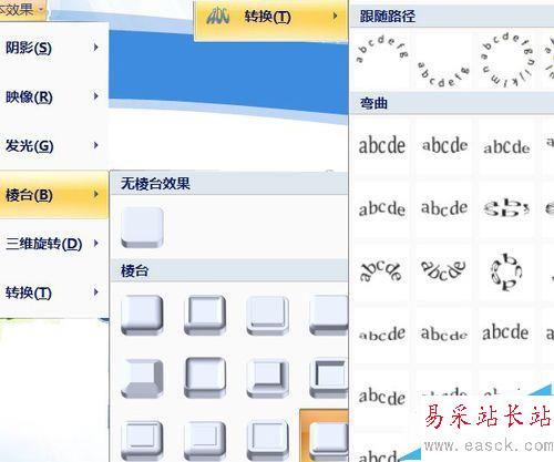 7、用文本輪廓給文字添加淺色邊。文本效果中將映像去除,轉換我選了陀螺形。棱臺選藝術裝飾。方法為主,效果按個人所需。完成藝術字制作。