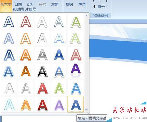 1、首先制作藝術字。插入——藝術字,選擇自己喜愛的樣式,我選的是:填充——強調文字顏色1,金屬棱臺,映像。