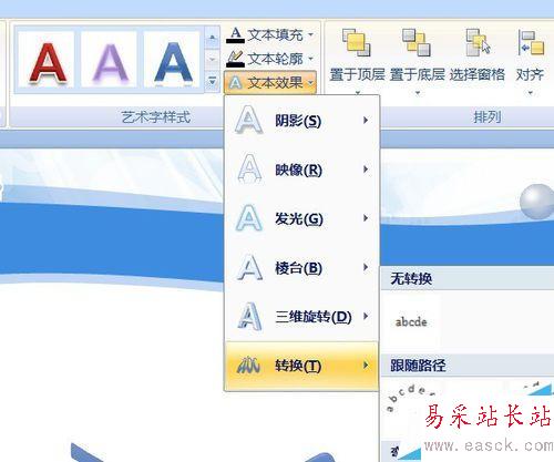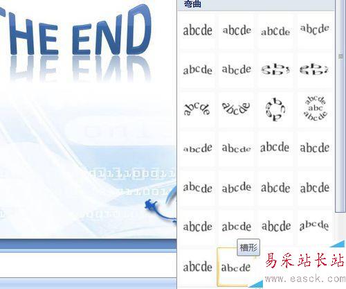 3、工具欄點格式按鈕,文本效果——轉換——彎曲——槽形。