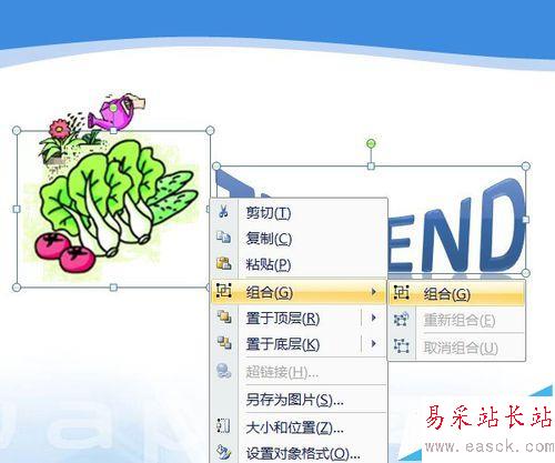 5、選中蔬菜與藝術字右鍵——組合。完成“結束”的組合。