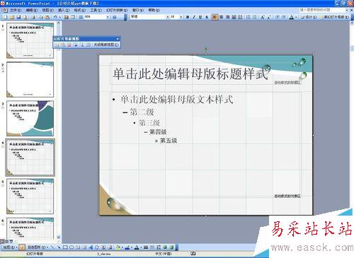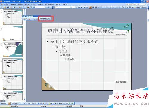 2、點擊菜單上的“視圖”——“母板”——“幻燈片母板”,出現下面步驟里的界面。