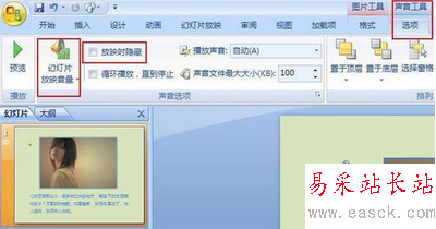 4、在PPT編輯狀態下,鼠標選中小喇叭圖標,此時PPT上方會出現一個聲音工具欄,選中這個工具欄中,將“放映時隱藏”勾選,再按F5播放時,小喇叭就自動隱藏了。