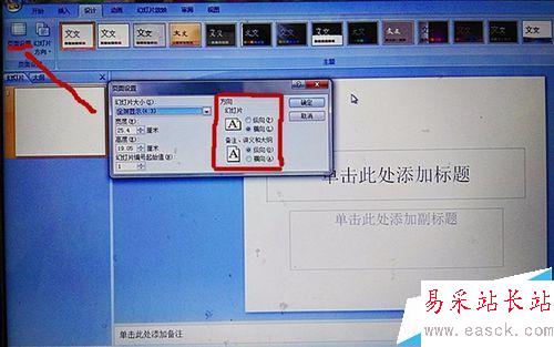還是打開“設(shè)計(jì)”菜單—“頁(yè)面設(shè)置”—“幻燈片方向”,看實(shí)際情況,選擇幻燈片是“縱向”或“橫向”,建議大家先把幻燈片方向調(diào)好,以防后面做好內(nèi)容后,再調(diào)紙張,引起一些不必要的麻煩。