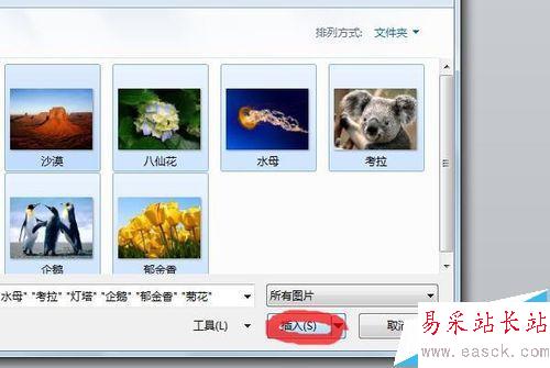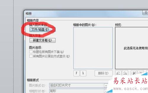 2、在彈出的“相冊”對話框中,點擊“文件/磁盤”按鈕,全選需要插入的圖片,并點擊插入。
