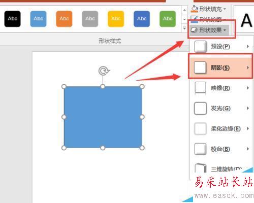 4、這里我們先說說陰影的設置,這里我們點擊形狀效果,然后會彈出一個選擇框,這里我們點擊陰影。在這界面我們可以看到很多很實用的工具,都是我們平時經常使用到的。