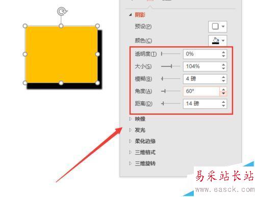 6、這里我們可以看到陰影的調整選項中可以選擇的就是透明度、大小、模糊度、角度、距離,我們分別對其經行調整就可以了,讓我們對圖形形狀效果達到我們要求的效果就可以了,這樣我們再關閉這個窗口就可以了。