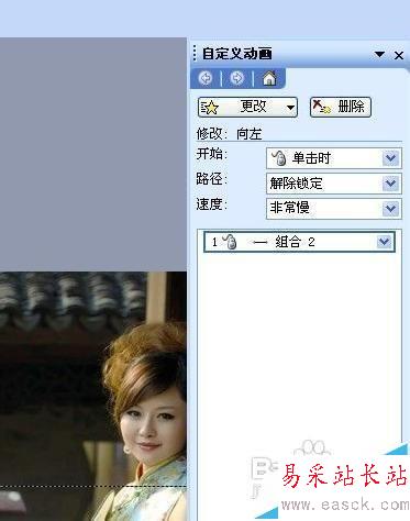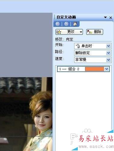 5、這里,拉到了幻燈片最左端一段距離之后。下面,我們來設置一下照片走動的速度。在右邊“自定義動畫”的窗口中,有這樣幾個選項:開始、路徑、速度。
