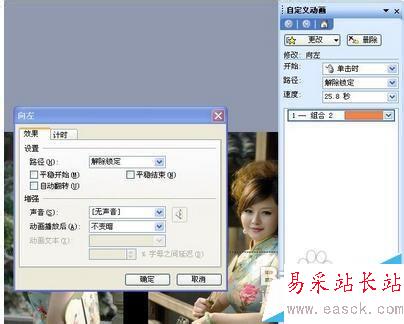 下面,開始設置這一組照片走動的“自定義動畫”,選取整租照片,右擊“自定義動畫”,右邊會出現(xiàn)一個窗口,在“添加效果”里,有一個“動作路徑”,因為我們要使整組圖片至右向左通過“膠片”區(qū)域,所以這里“動作路徑”中選擇“向左”。我們會看到在整組照片的中間出現(xiàn)一個紅綠箭頭,如圖