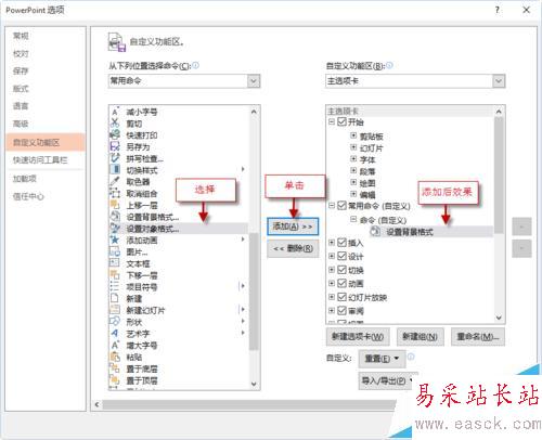 7、在“從下列位置選擇命令”欄中的列表框中選擇“設(shè)置背景格式”選項(xiàng),單擊“添加”按鈕,將此名稱添加到自定義組中,如下圖所示。