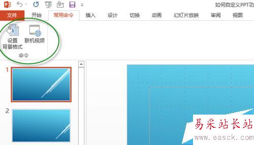 9、如下圖,返回PPT工作界面,單擊“常用命令”選項(xiàng)卡,在“命令”組總可看到剛添加的兩個(gè)命令,如下圖所示。