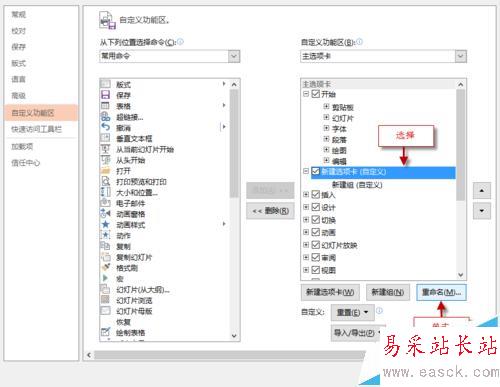3、選擇“新建選項(xiàng)卡(自定義)”選項(xiàng),單擊“重命名”按鈕,如下圖所示。