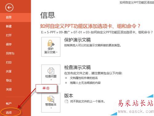 1、打開PPT中“文件”選項(xiàng)卡,單擊“選項(xiàng)”,打開“PowerPoint選項(xiàng)”對話框,如下圖所示。