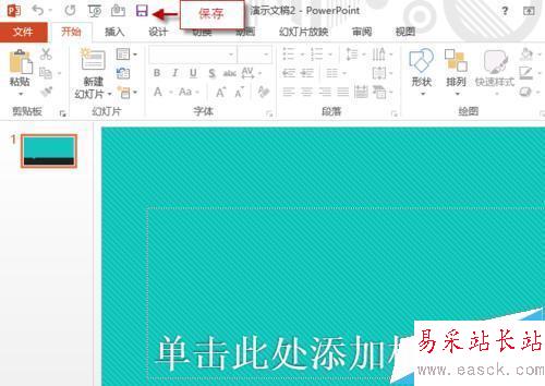 1、在制作萬演示文稿或者在演示文稿的制作過程中都會涉及保存操作,而第一次對演示文稿進行保存會稍顯復雜。在新建的演示文稿中找到工作界面中快速訪問工具欄中的“保存”按鈕(也可以用組合鍵:Ctrl+S),如下圖。