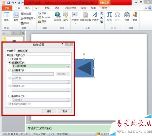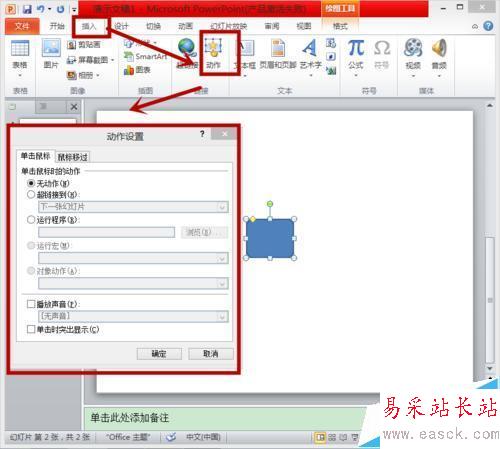 6、同樣的,可以選中”圓角矩形“,選擇插入里的動作,會出項和剛才動作按鈕一樣的窗格,所以我們可以通過為圖形添加動作的方法來設置動作按鈕。