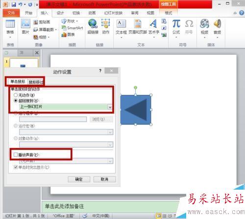 3、主要的應用有動作的觸發,是“鼠標經過”或者“單擊鼠標”。觸發后產生的效果,可以選擇想要連接到的位置。還有播放聲音的設置。其他選擇不常用,需要一定的功能,這里不介紹。