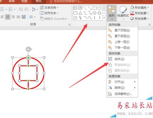 5、或者我們還是先選擇我們的圖形,然后點擊格式,然后我們再選擇我們的排列快捷鍵,這樣我們可以在這里面看到也是有一個組合的選項的,那樣我們這種方式也是一樣的。