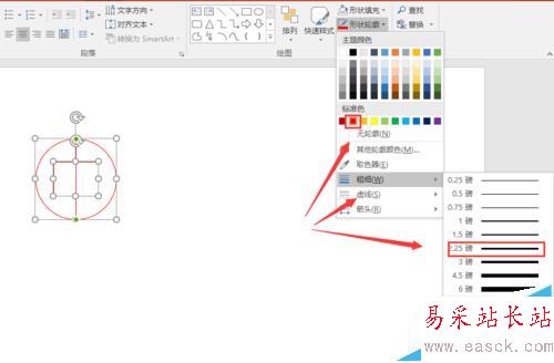 2、然后我們把我們的邊框顏色給設(shè)置成為紅色,那樣比較美觀,這里我們就是點擊PowerPoint2016界面的右上角的格式然后點擊形狀輪廓,然后修改顏色以及線條的線寬,這樣我們就完成圖形的設(shè)置了。