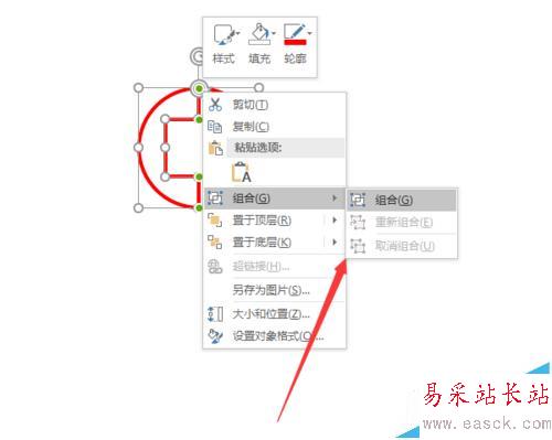 4、對于組合的方式有很多種,那么我們分別介紹一下吧。這里我們可以框選出我們需要組合的圖形,然后我們點擊鼠標(biāo)右鍵,然后選擇我們的組合選項,然后再點擊選擇最后的組合選項,那樣我們的散亂圖形就成為了一個整體了。