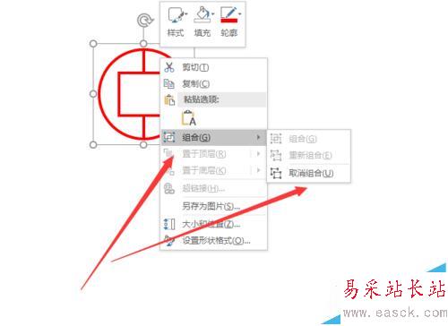 1、如果我們需要解除我們的組合怎么辦呢?其實和我們組合的方式是一樣的,這里我們還是框選我們的圖形,然后點擊右鍵,然后選擇組合,可以看到有一個取消組合的選項,那樣我們就成功的解除了。