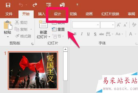 1、打開演示文稿,單擊“設計”選項在如圖中的位置所示。