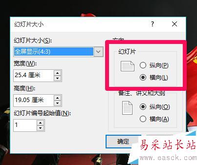 1、打開”幻燈片大小對話框“,直接單擊“幻燈片大小”下拉按鈕,選擇合適大小,也可以在寬度和高度文本框中直接輸入數字,最后確認即可。