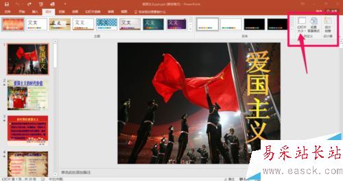 2、之后再界面的右側可以看到“幻燈片大小”圖標,2016版的PPT講“頁面設置“隱藏到了此圖標所含內容內。