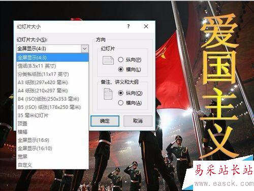 3、單擊后選擇選項組中的”自定義幻燈片大小“。